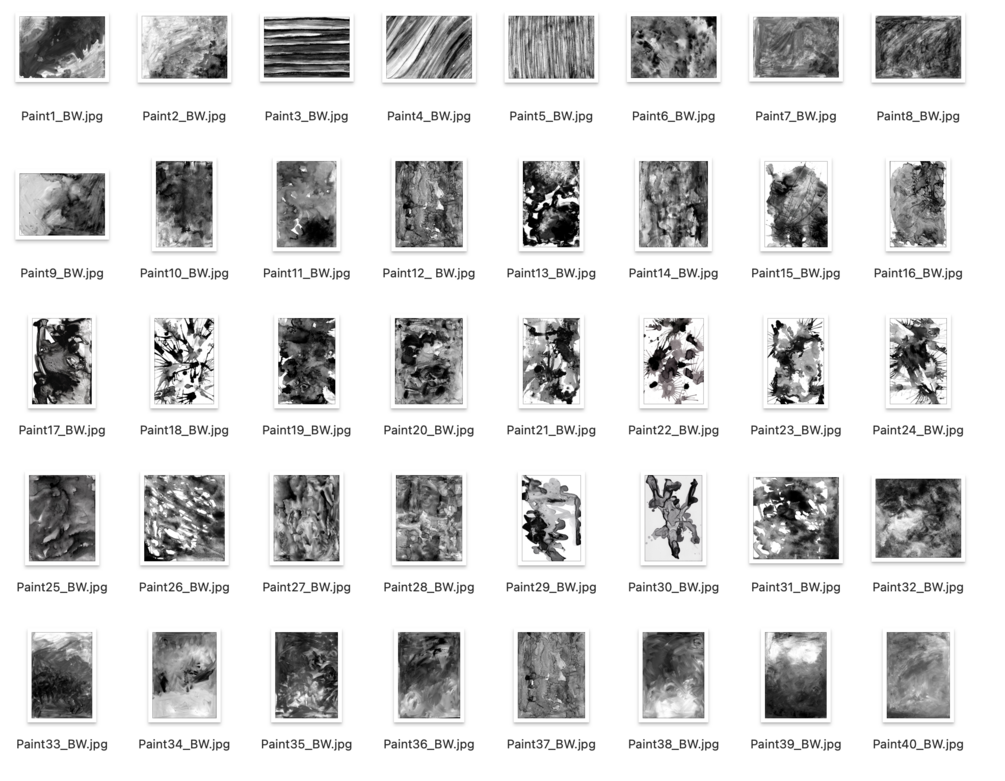 40 different paint sheets, created by hand and scanned in at 600 DPI. They are black and white but can be colored digitally and the contrast can be edited.